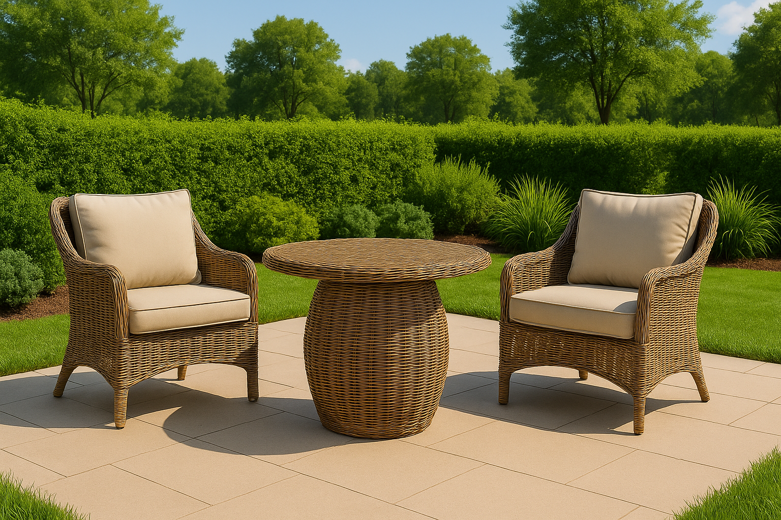 Sada zahradního nábytku z ratanu s modrými polštáři a stolkem
